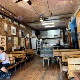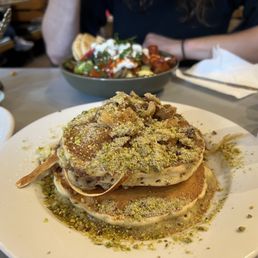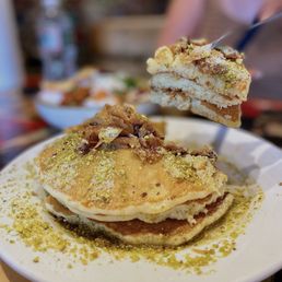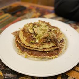 baklava pancakes 5/5 spicy sausage shakshuka 5/5 Fantastic place for brunch! Cash only, extremely casual ambience, decent service. Would highly recommend getting the baklava pancakes and za'atar egg bowl at the same time if you can. The switch between the savory egg bowl and the sweetness of the baklava pancakes is sublime! The flavors of both dishes individually go exceptionally well with the different elements of each dish. Will have to get around to trying other dishes on the menu, but every time I go here, I can't help, but getting these two. They don't take reservations so going during odd hours is your best shot at not having a long wait time before being seated. Seating is either in 4 person booths or 2 person tables. There's metered street parking available nearby that I've never had issues getting.